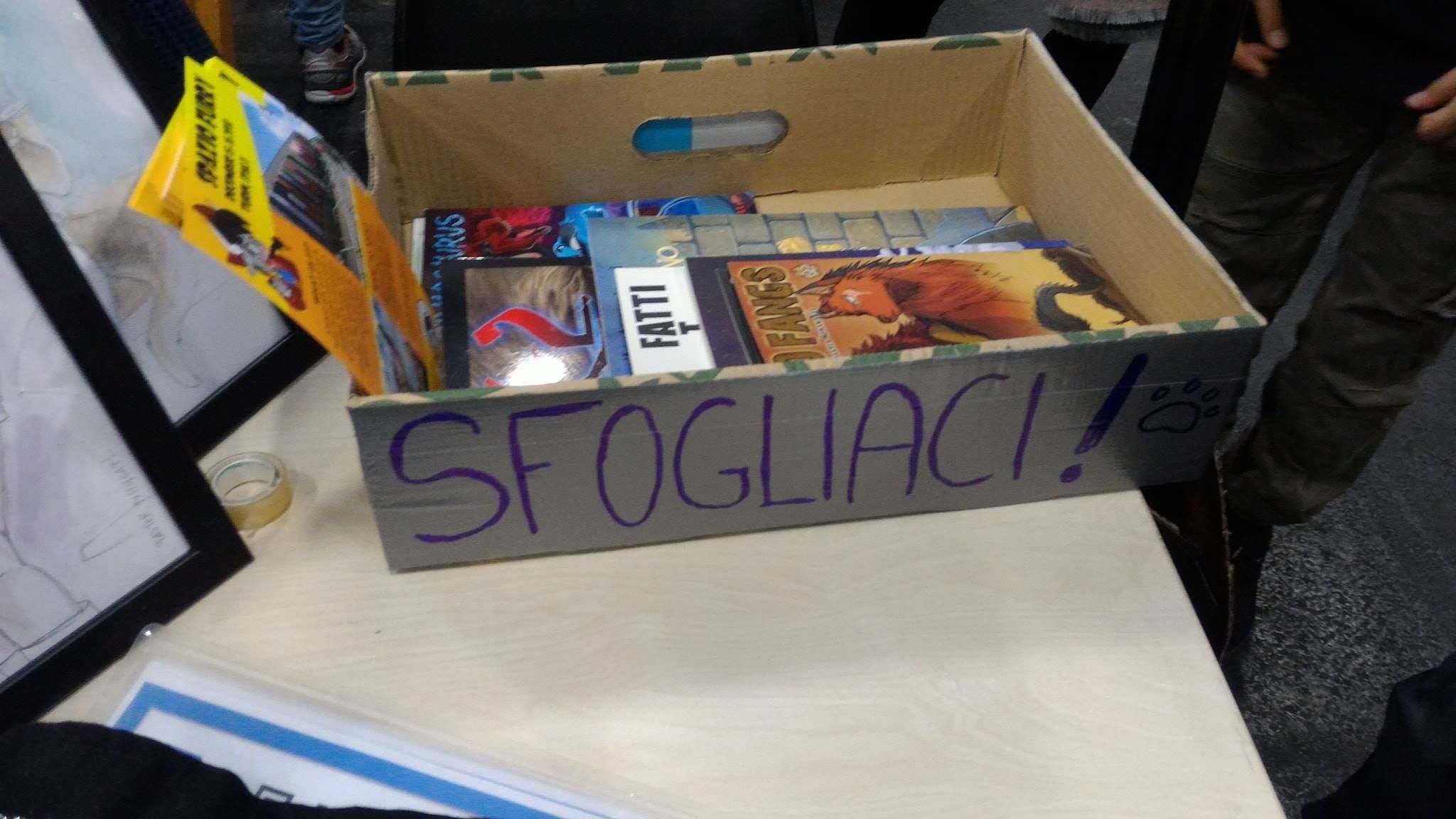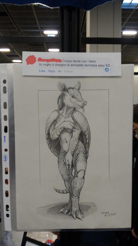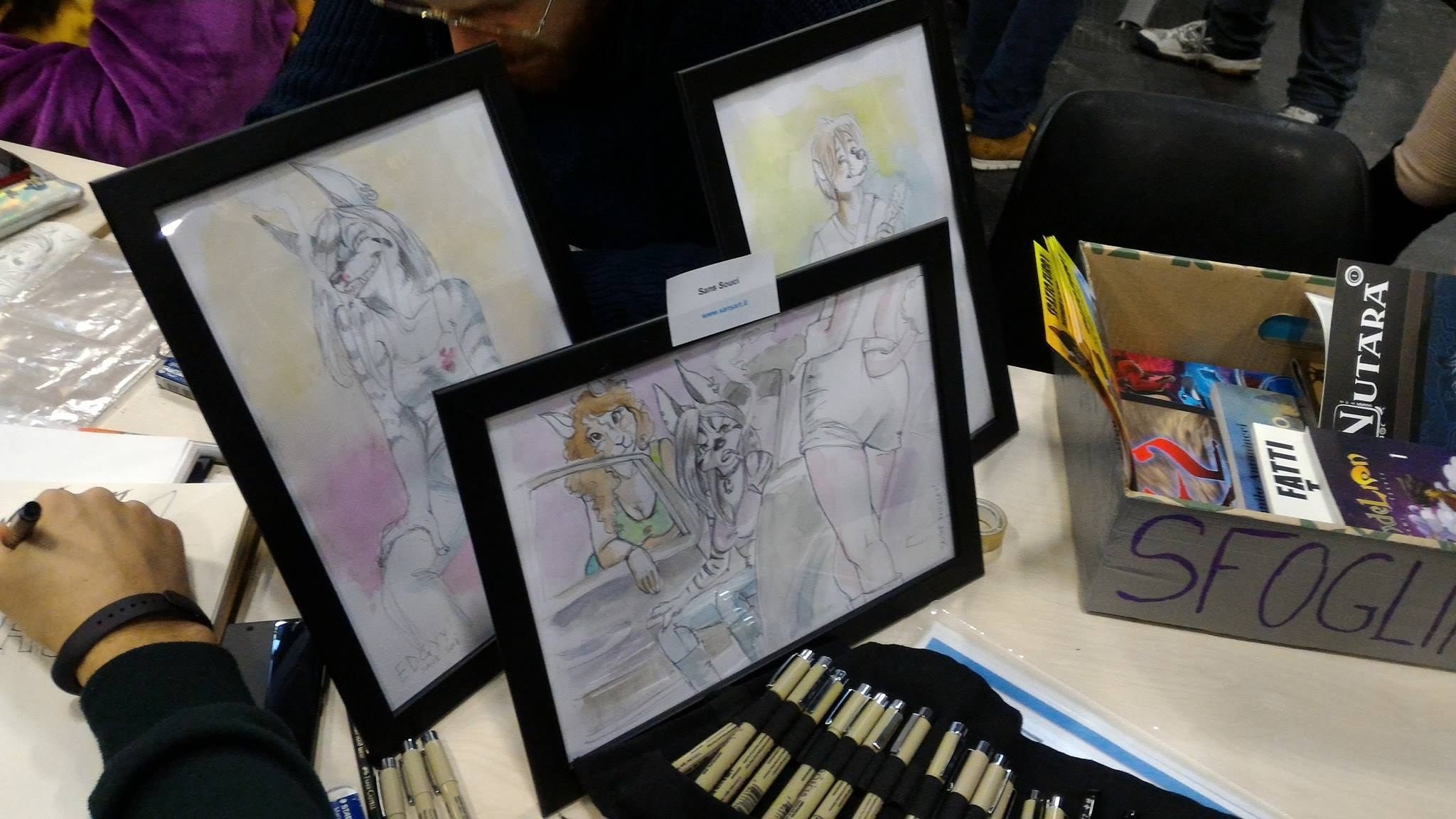 Lo stand, nel suo piccolo, era organizzato in maniera ingegnosa: lungo le pareti erano appese opere di artisti furry italiani, disposti su un tavolo c’erano alcuni volumi dei più famosi fumetti a tema furry, consultabili da chiunque fosse di passaggio.